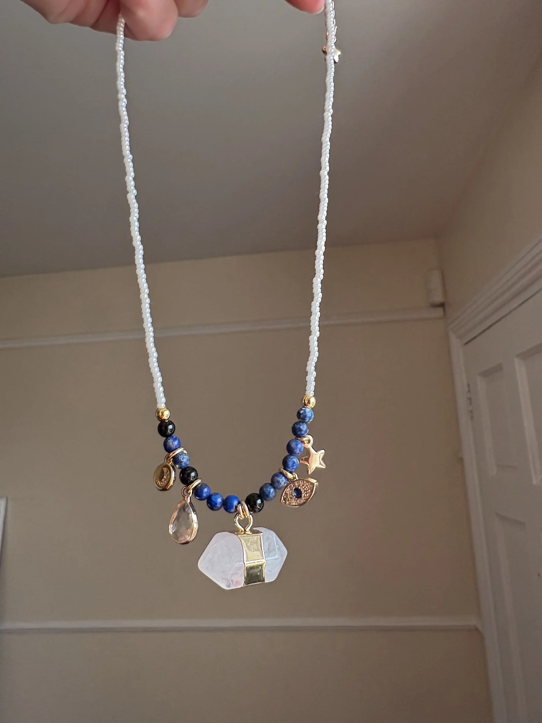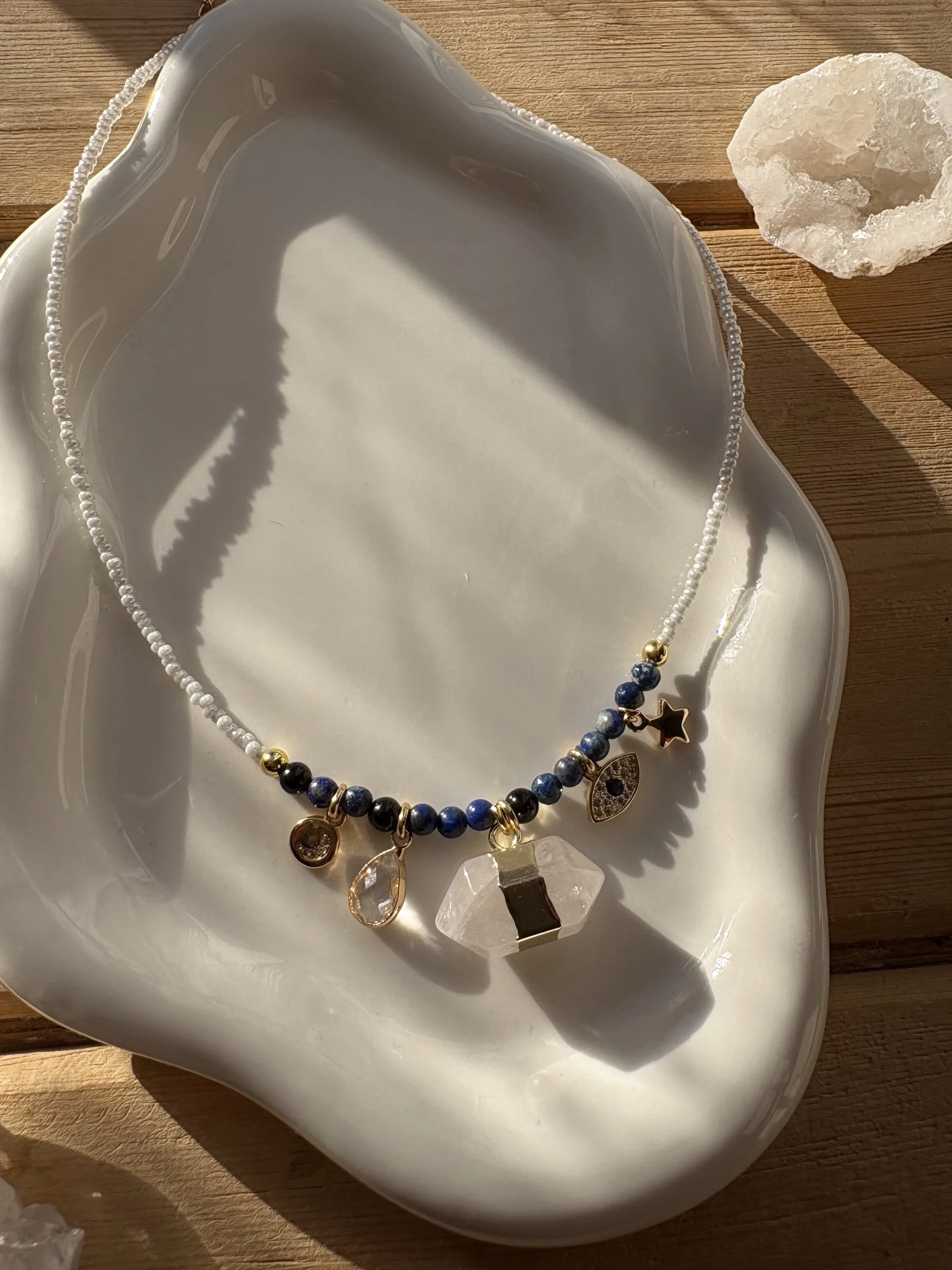 This handcrafted necklace features a striking blend of deep blue lapis lazuli beads, shimmering clear quartz, and a collection of delicate gold-tone charms that add a touch of whimsy and elegance.