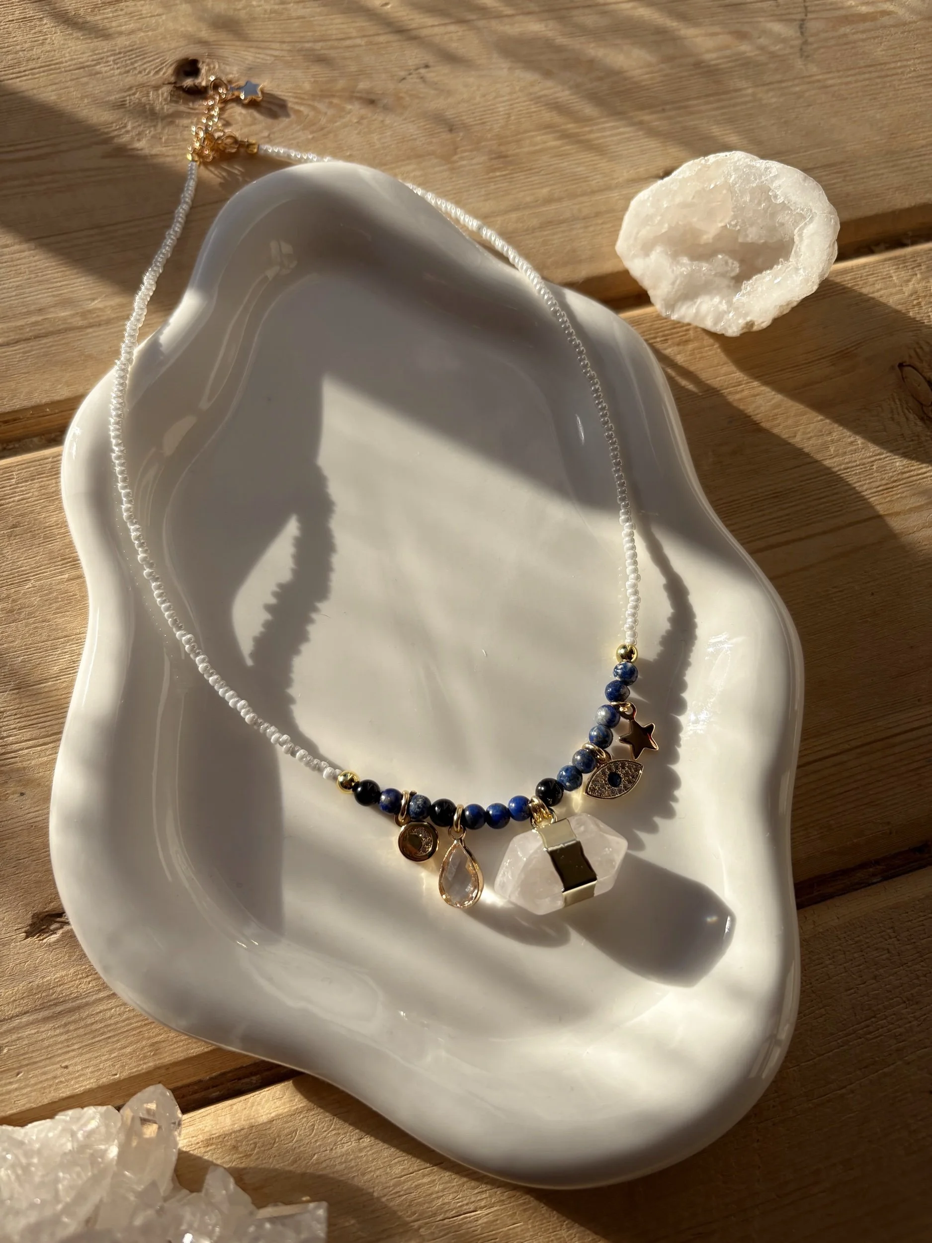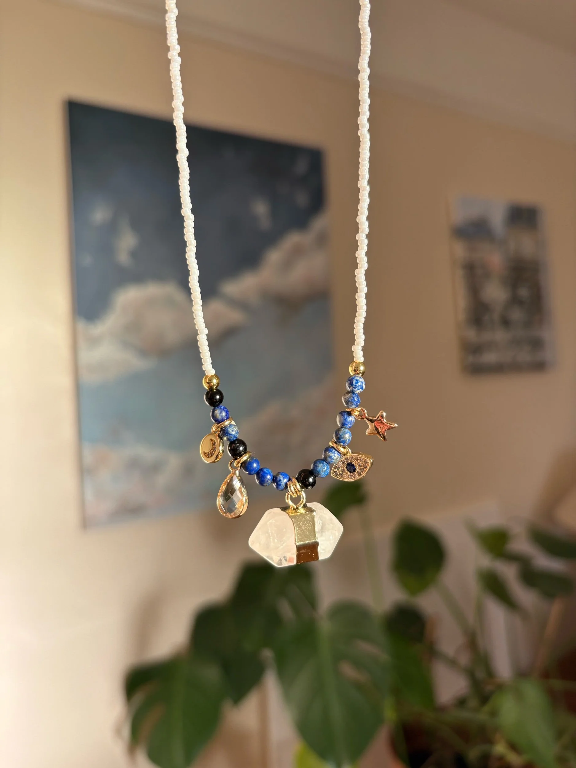 The rich lapis lazuli offers a bold contrast to the soft sparkle of the clear quartz drop, creating a balanced and eye-catching centrepiece. Clear quartz is often appreciated for its bright, uplifting energy, while lapis lazuli has long been associated with wisdom and clarity together giving the piece a thoughtful, meaningful feel. Finished with fine white seed beads for a light, refined look, this necklace brings together colour, texture, and symbolism in a way that feels both modern and timeless.