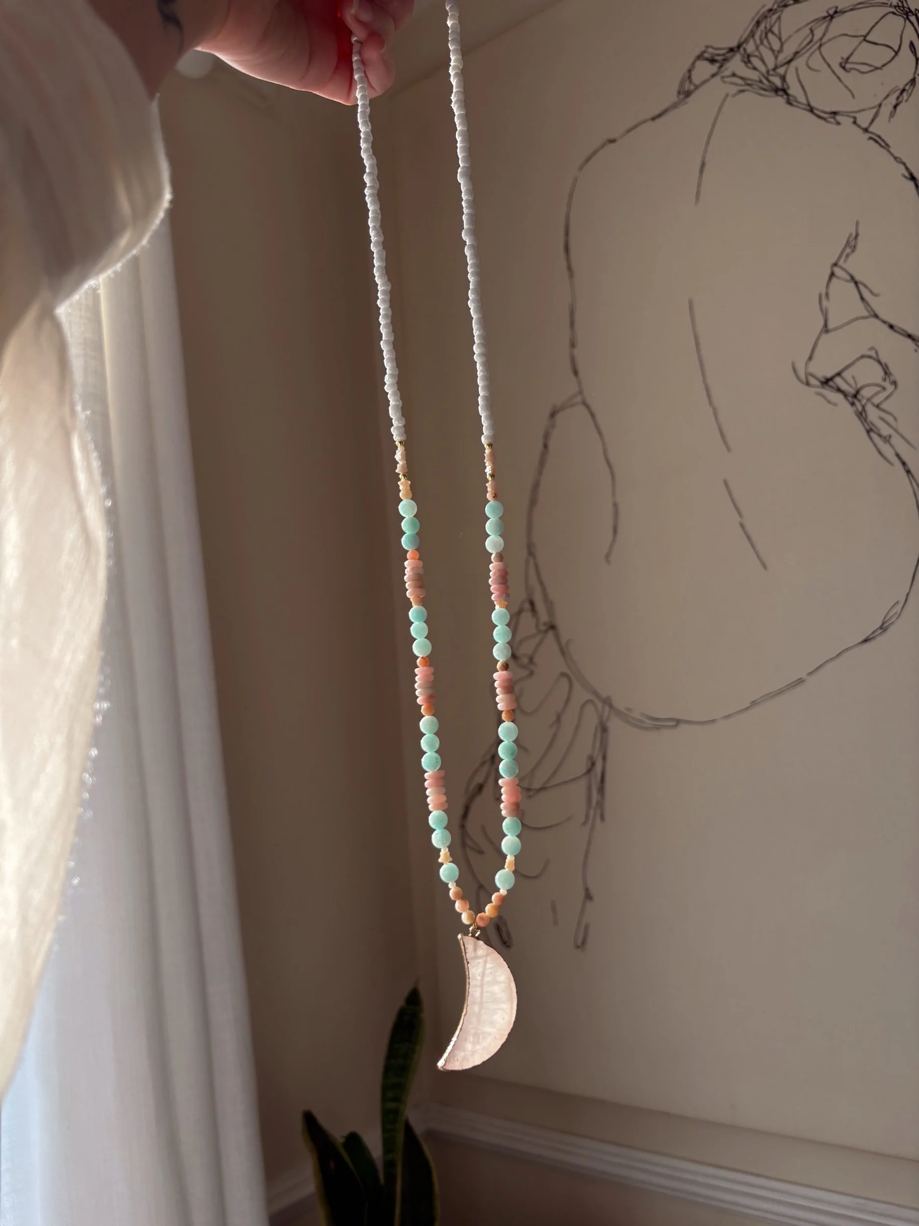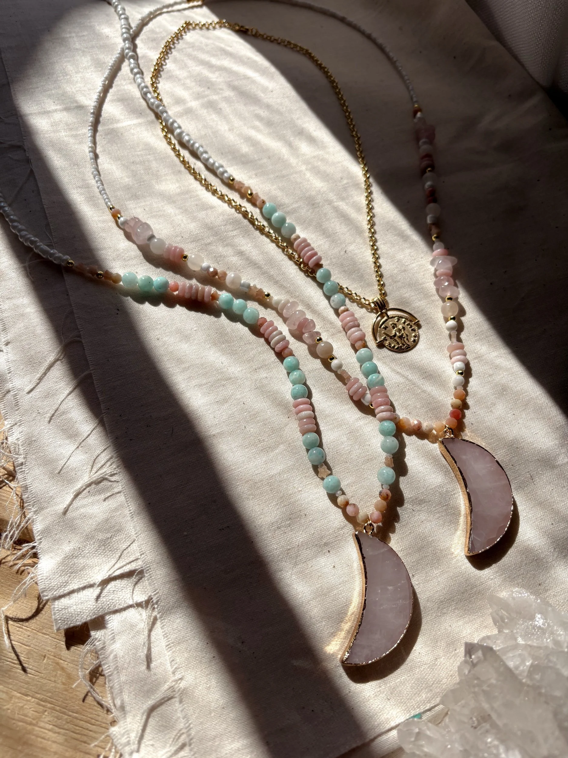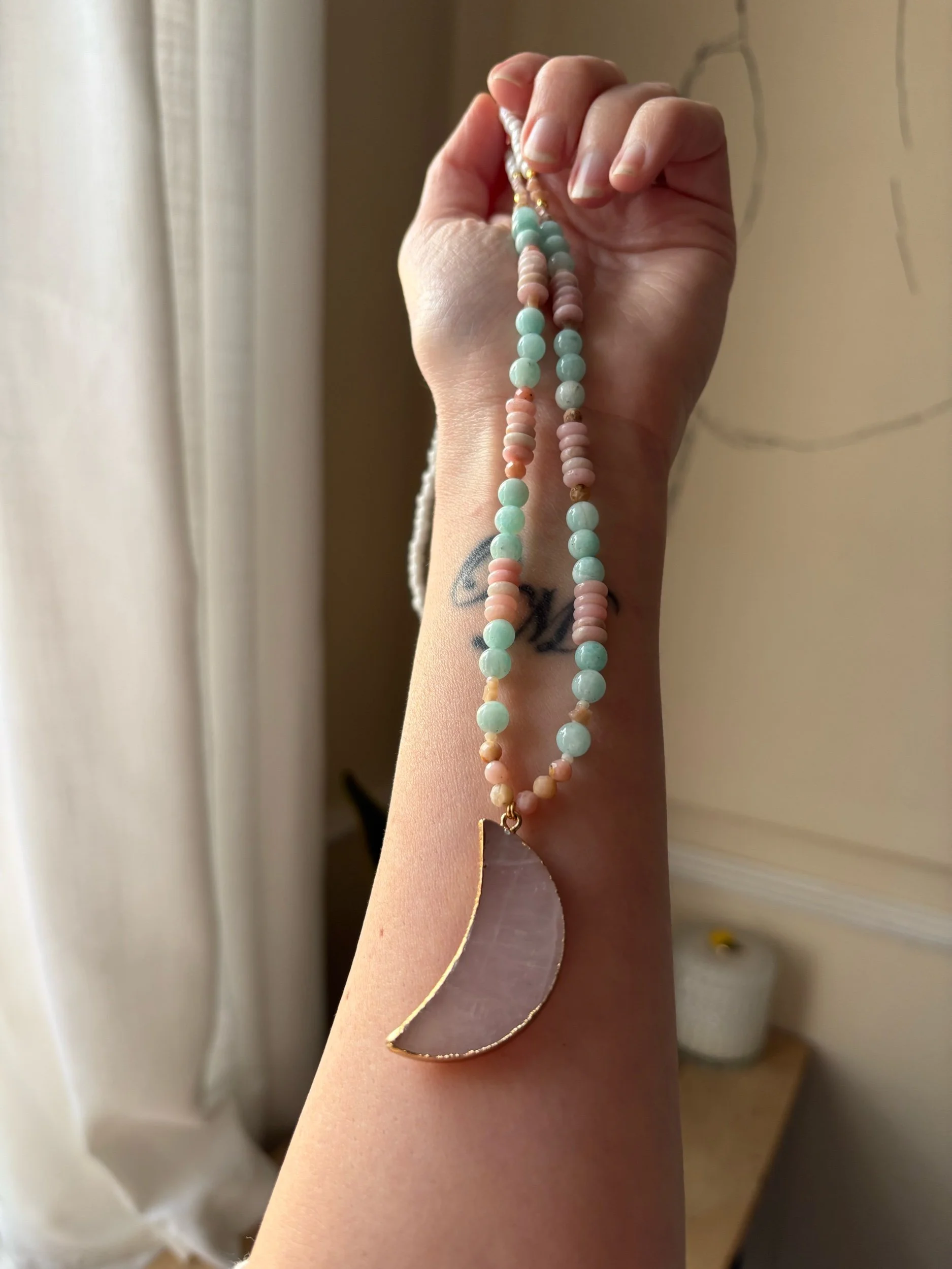 A beautiful handmade beaded necklace with Rose Quartz Druzy Moon Pendant.
