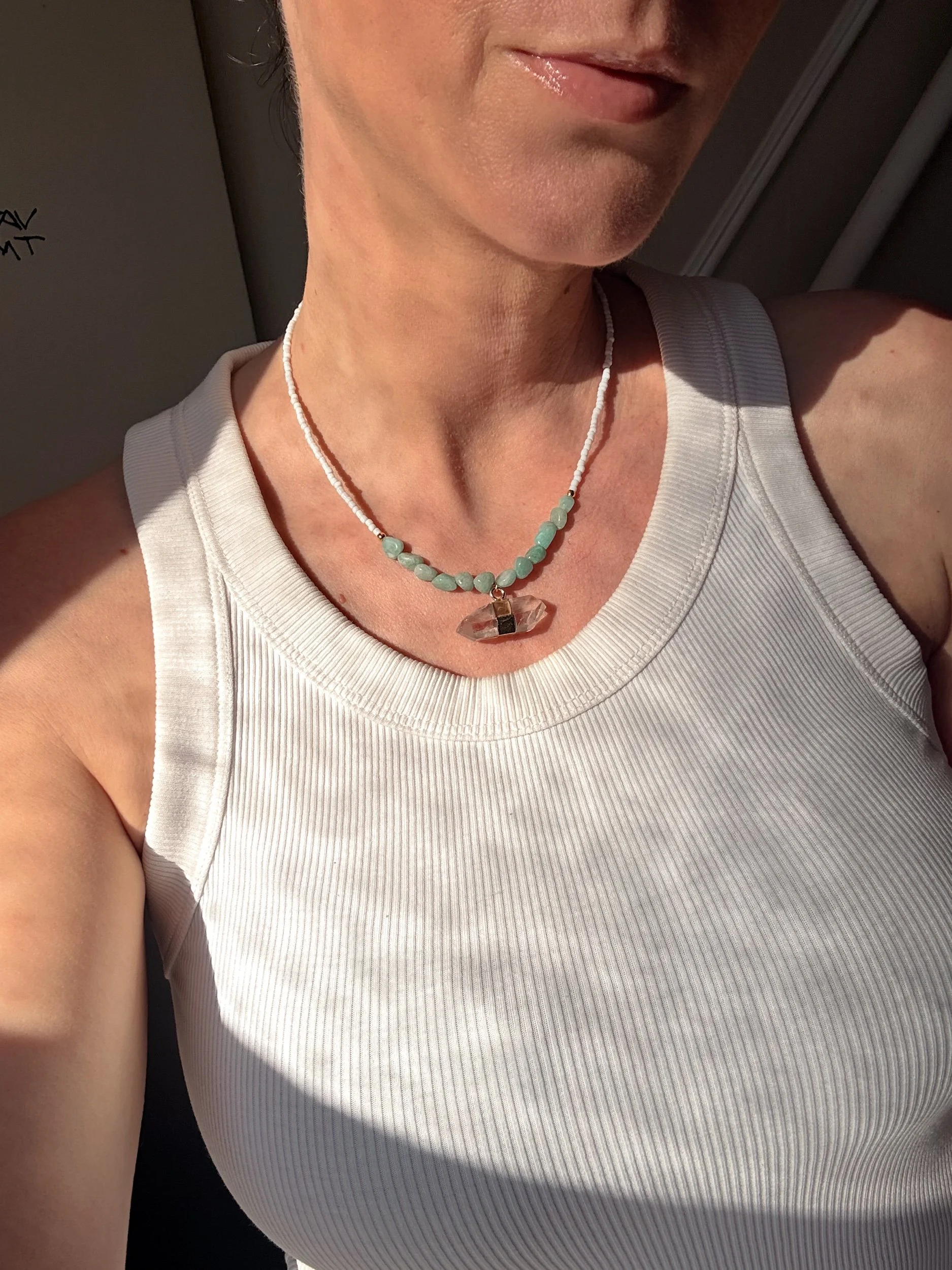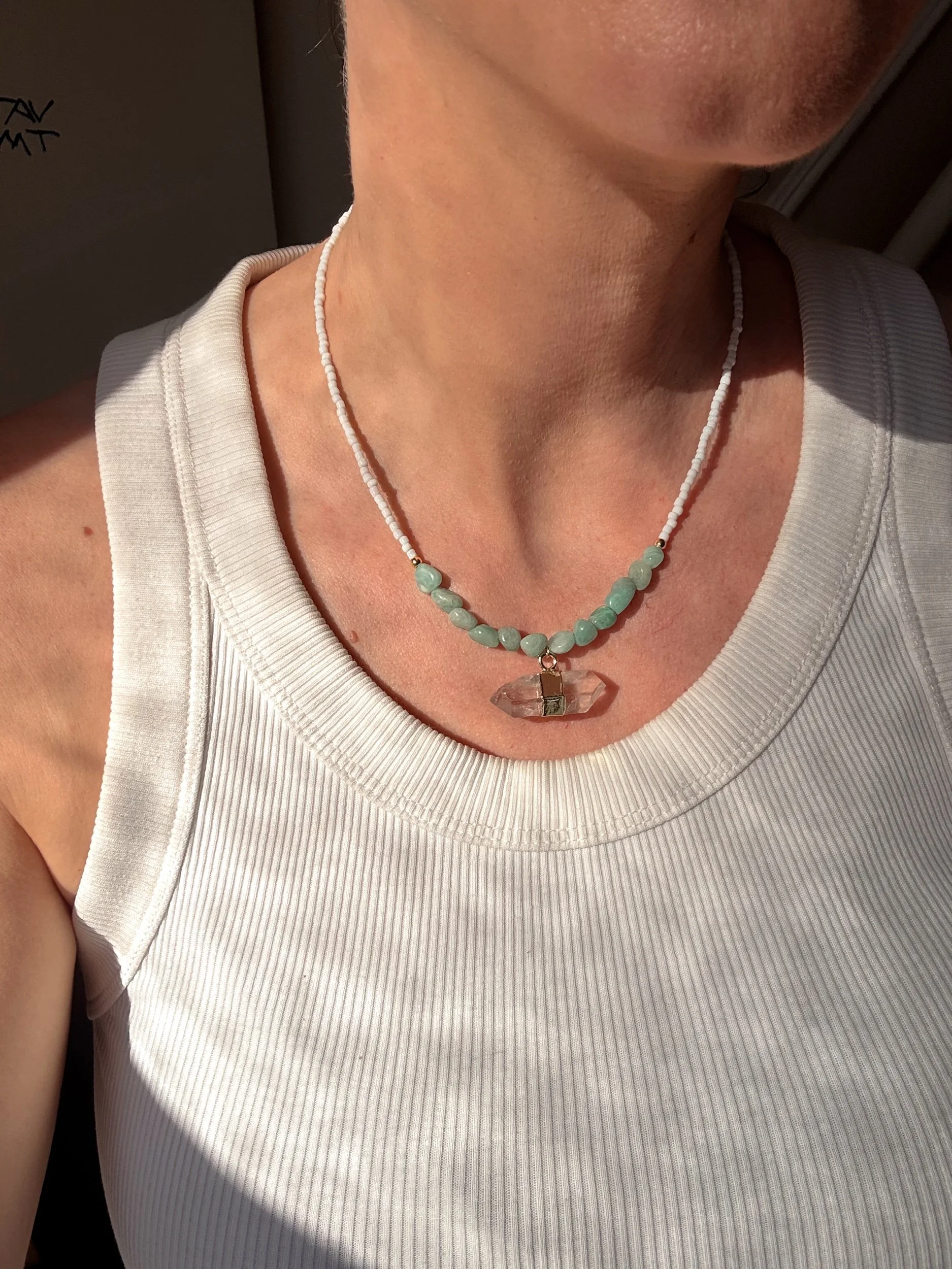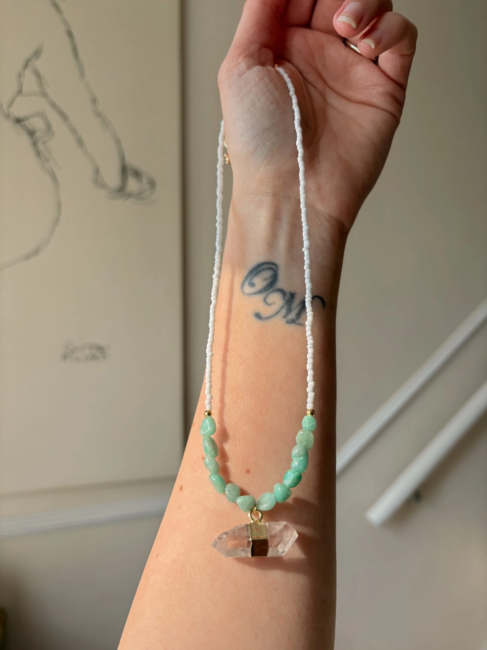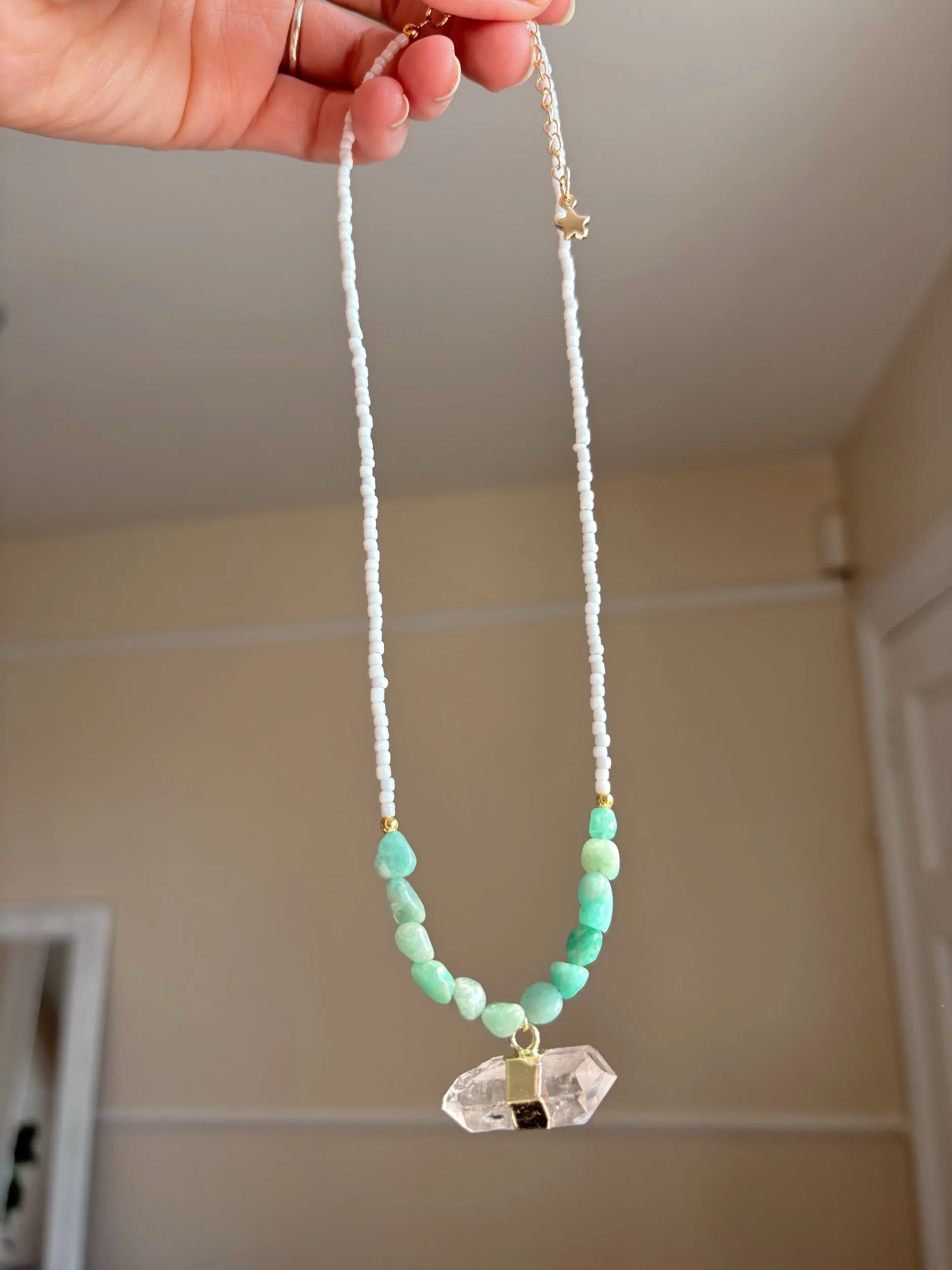 Shop › The Cleo necklace - Amazonite and clear Quartz Image 1 of 4 Image 2 of 4 Image 3 of 4 Image 4 of 4 The Cleo necklace - Amazonite and clear Quartz £24.99 Sold Out Beaded necklace with 18k gold plated fixings. Amazonite beads and clear Quartz pendant Sold Out Added! Beaded necklace with 18k gold plated fixings. Amazonite beads and clear Quartz pendant Reviews Reviewer Name Review Date Star Rating Description Posted on Etsy Product Show More