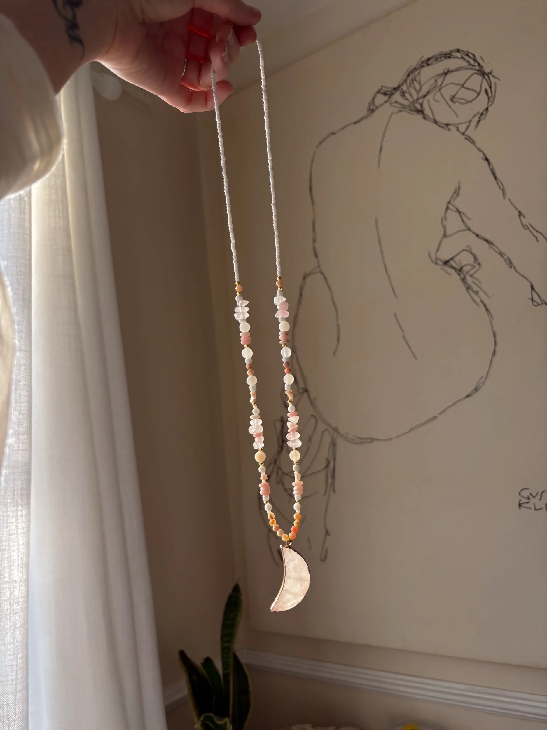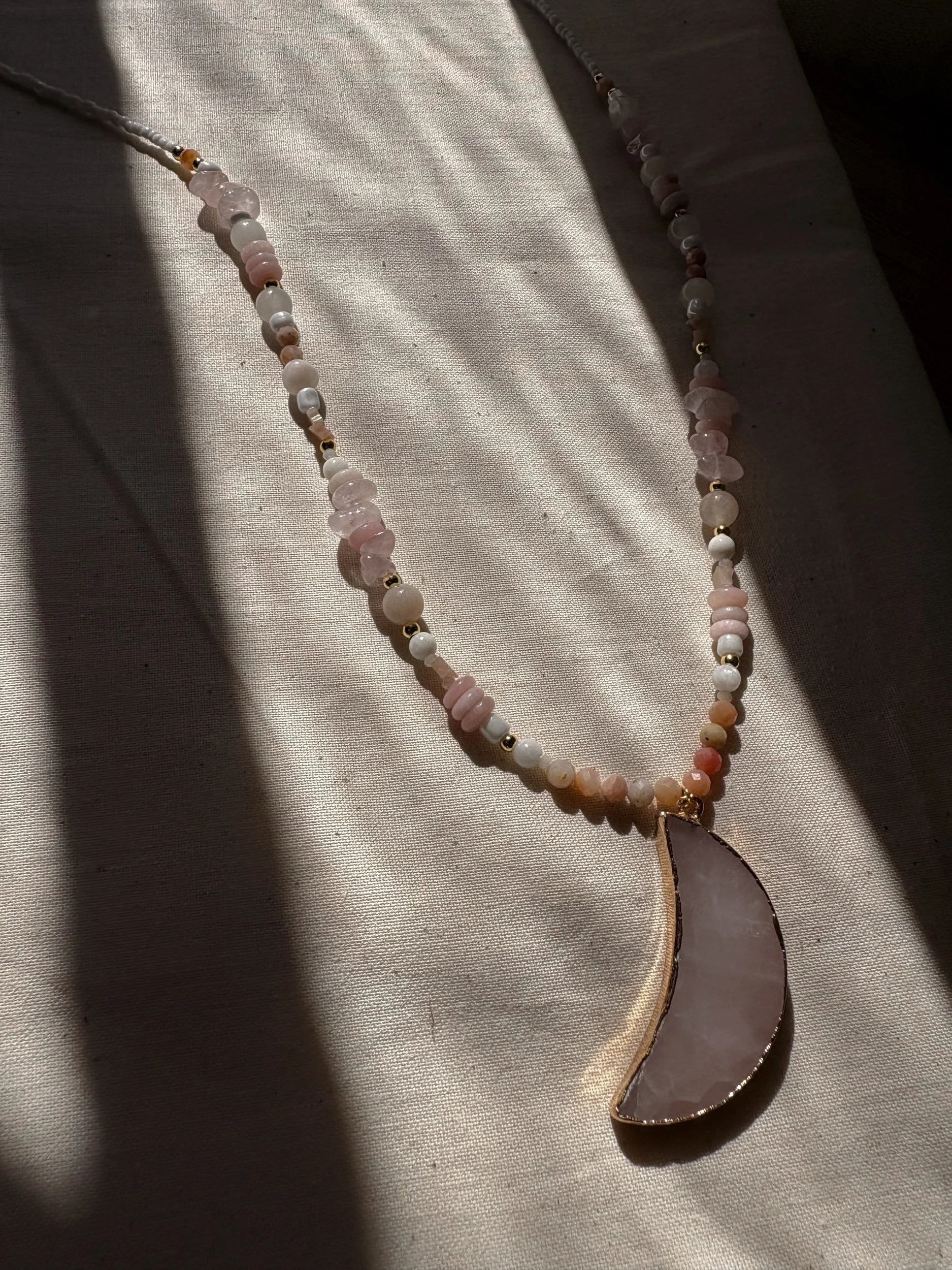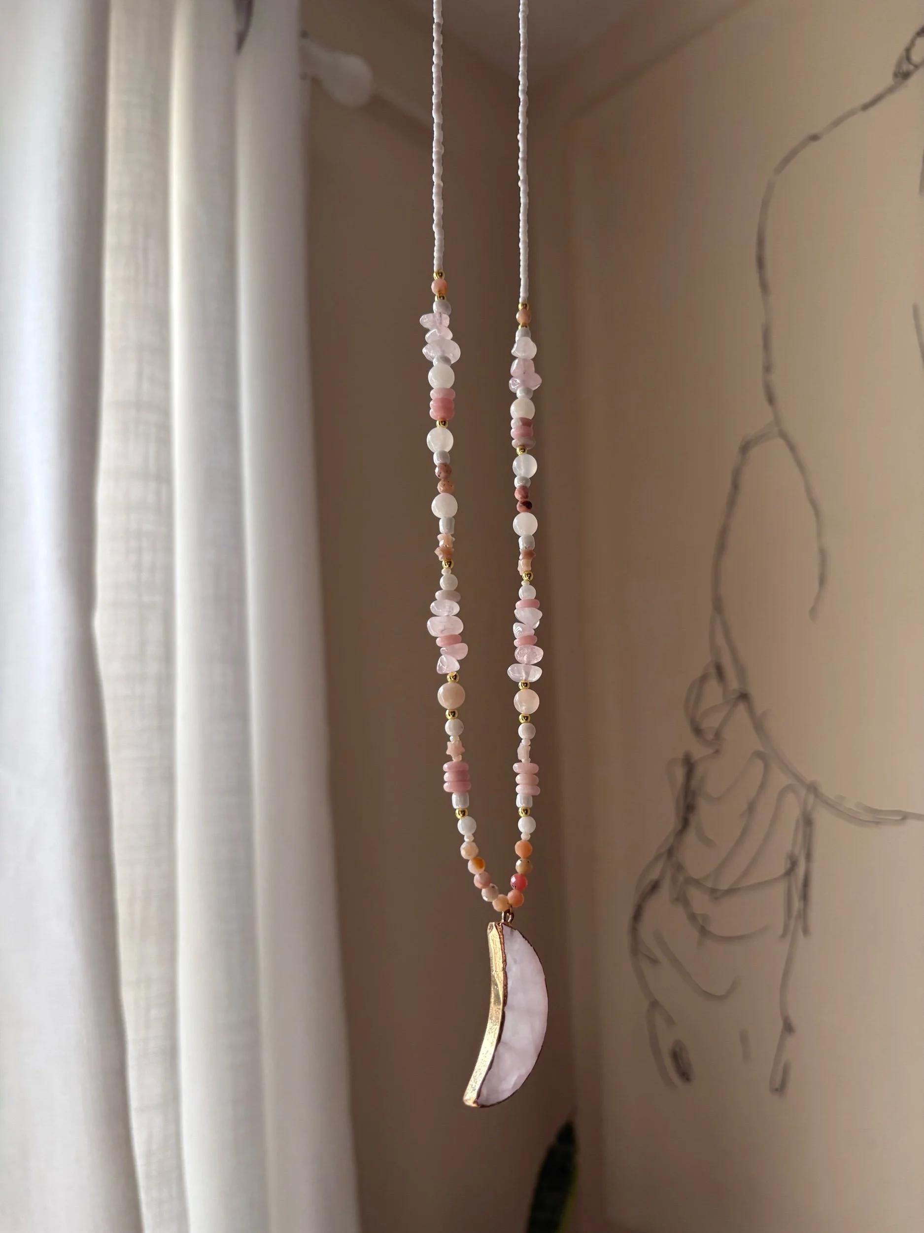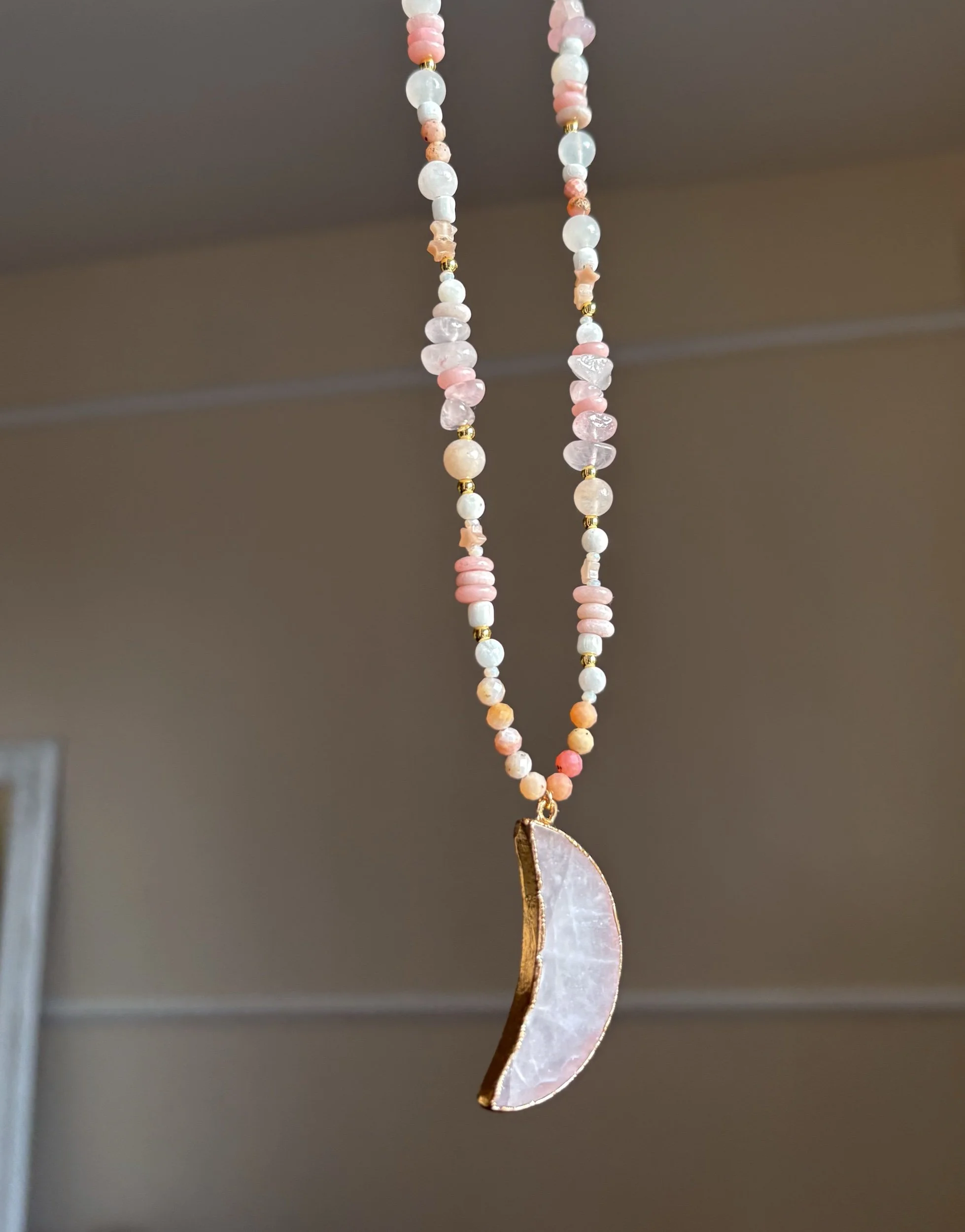 A beautiful handmade beaded necklace with Rose Quartz Druzy Moon Pendant