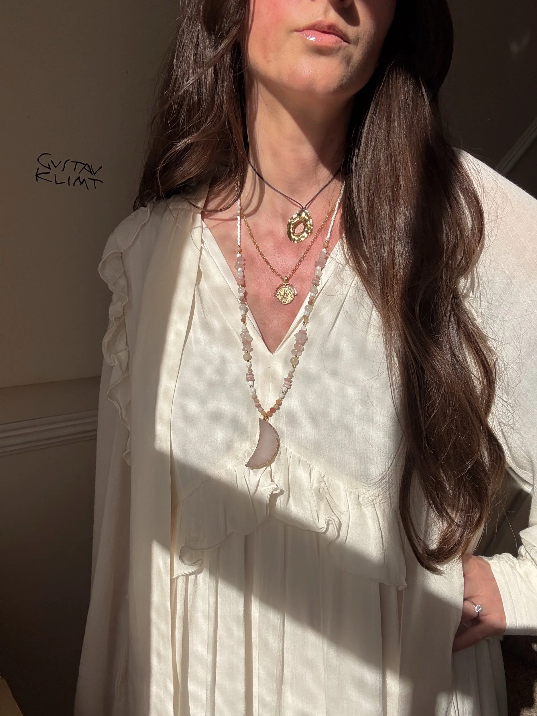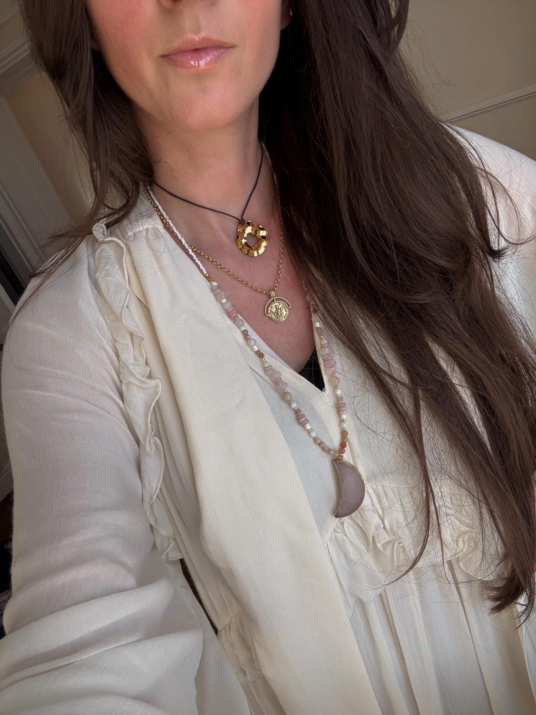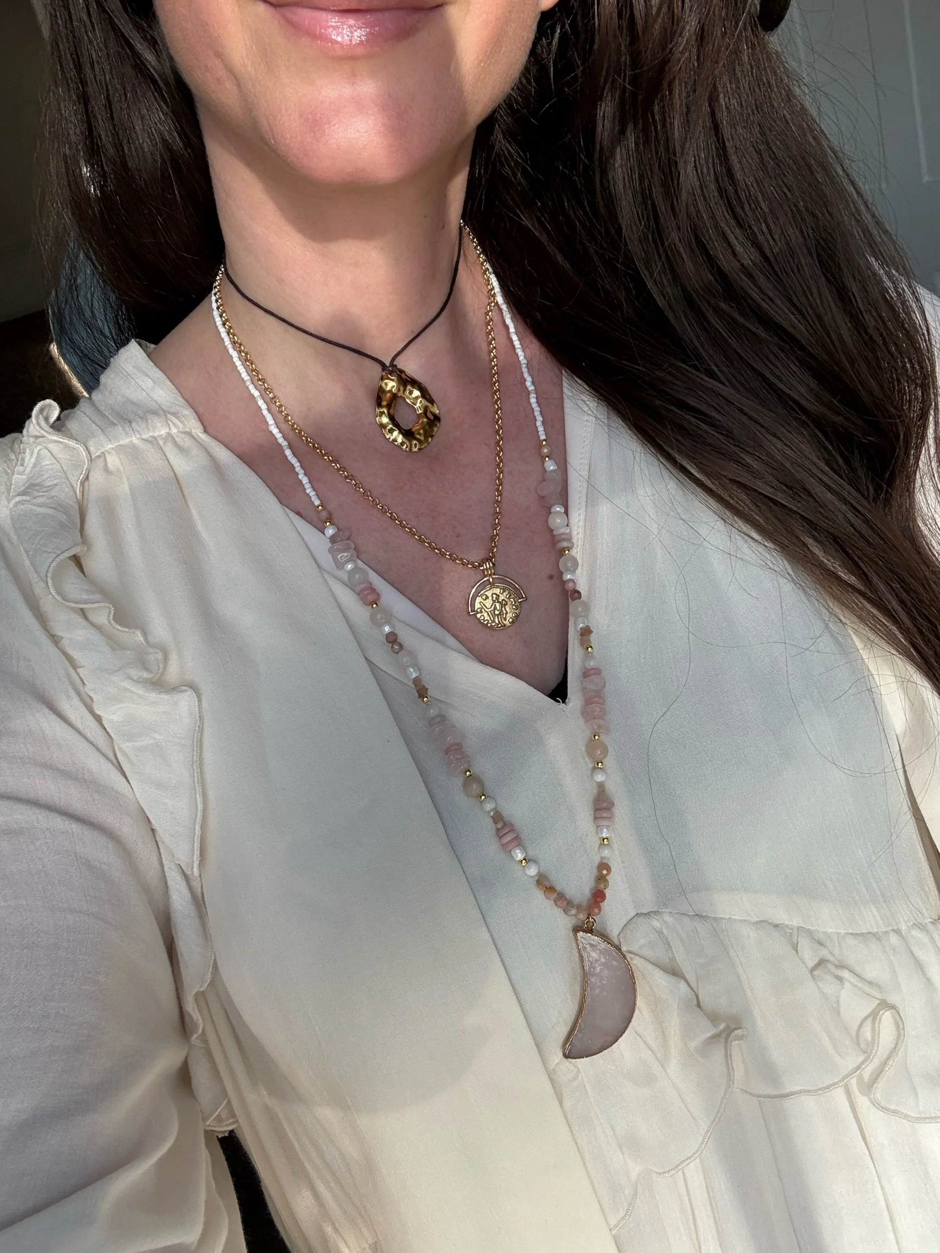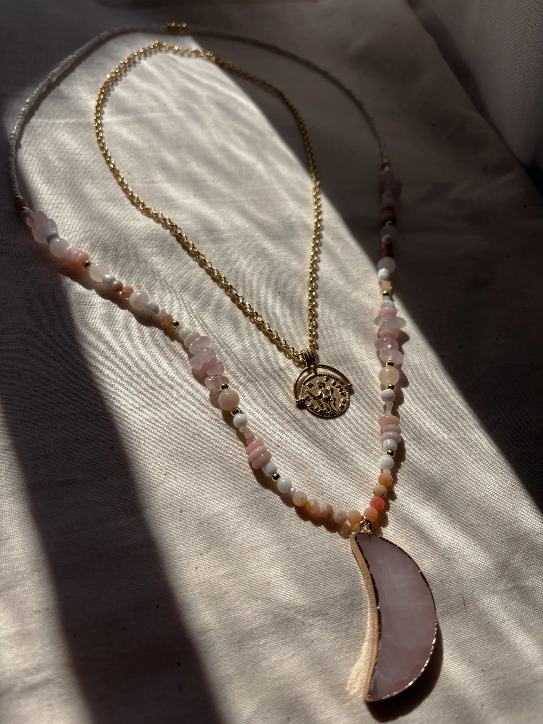 A beautiful handmade beaded necklace with Rose Quartz Druzy Moon Pendant