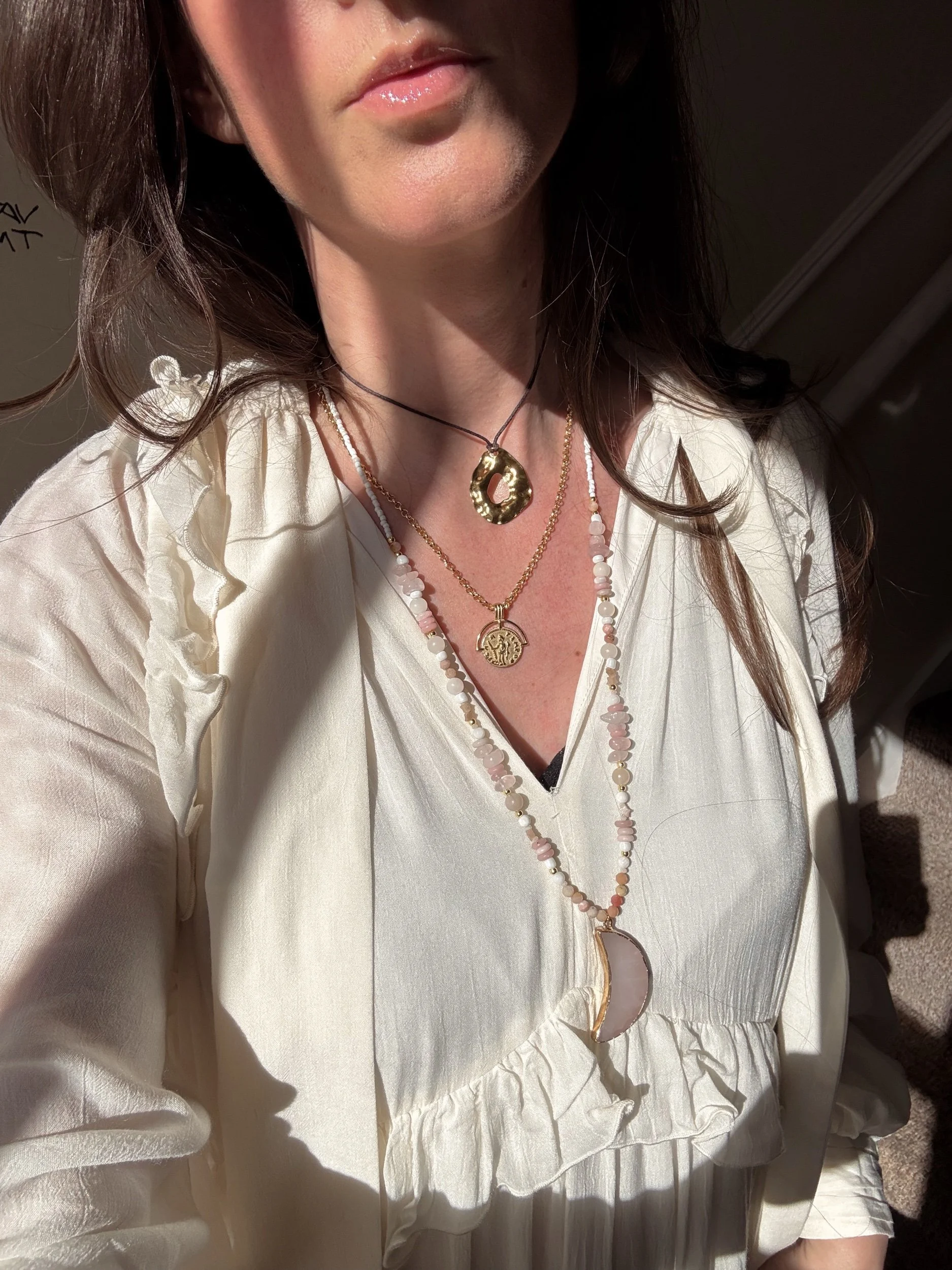 Featuring white seed beads, pink opal beads, pink Aventurine, moonstone and rose quartz for a feminine, empowering statement necklace - 27 inch in length