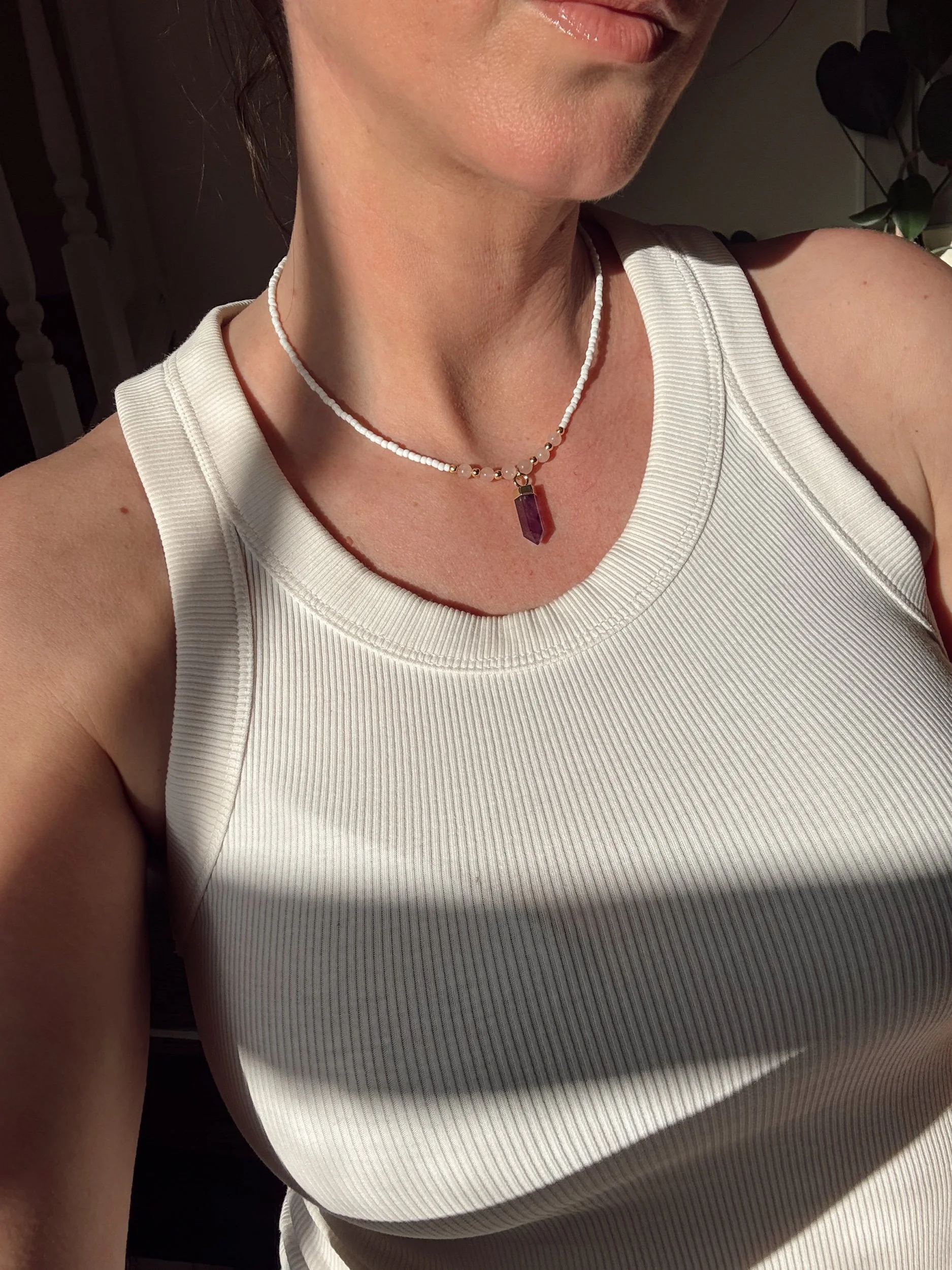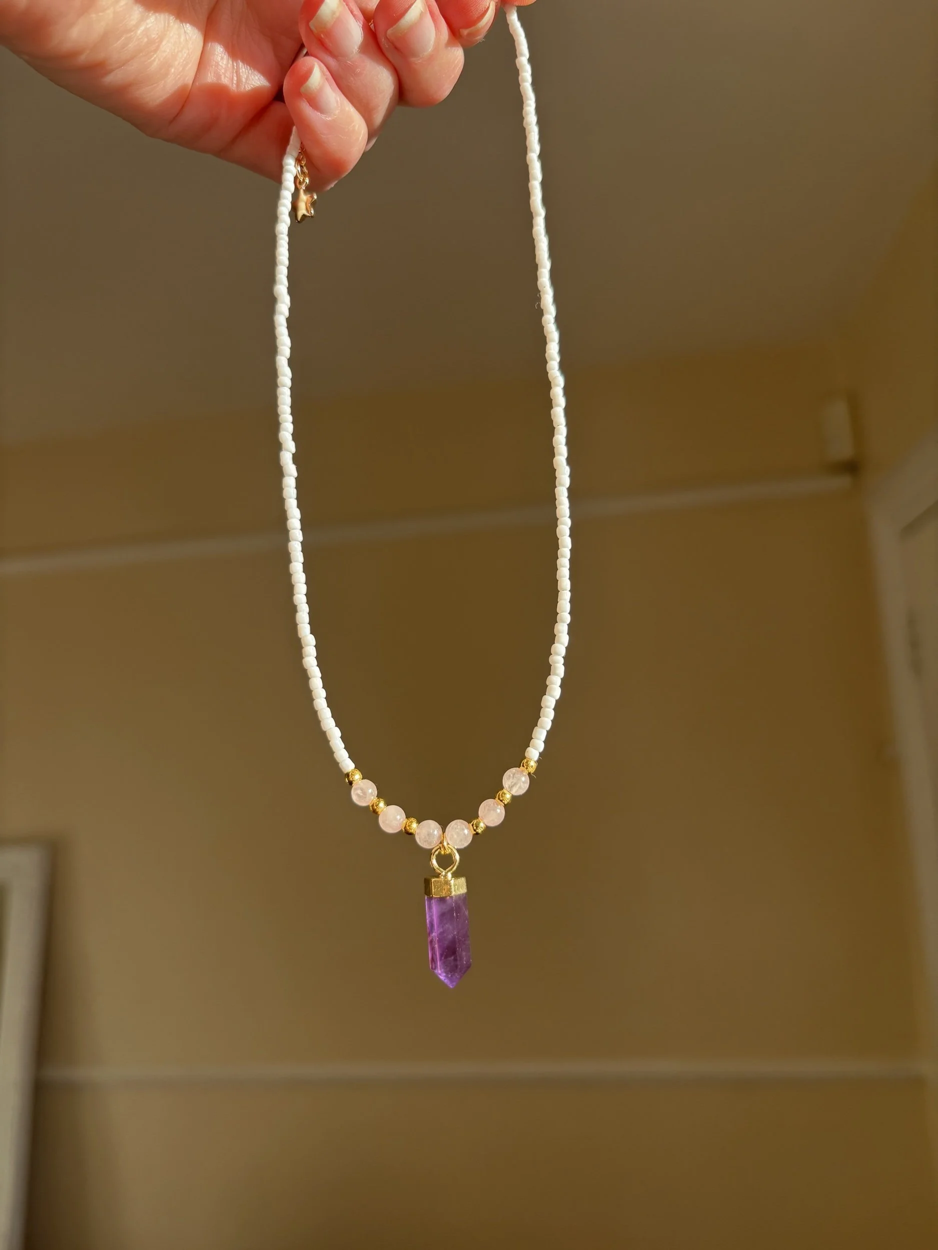 Shop › The Angela Necklace - Rose Quartz beads and Amethyst pendant Image 1 of 2 Image 2 of 2 The Angela Necklace - Rose Quartz beads and Amethyst pendant £29.99 Sold Out Beaded necklace with gold plated fixings - amethyst pendant and rose quartz beads Sold Out Added! Beaded necklace with gold plated fixings - amethyst pendant and rose quartz beads Reviews Reviewer Name Review Date Star Rating Description Posted on Etsy Product Show More